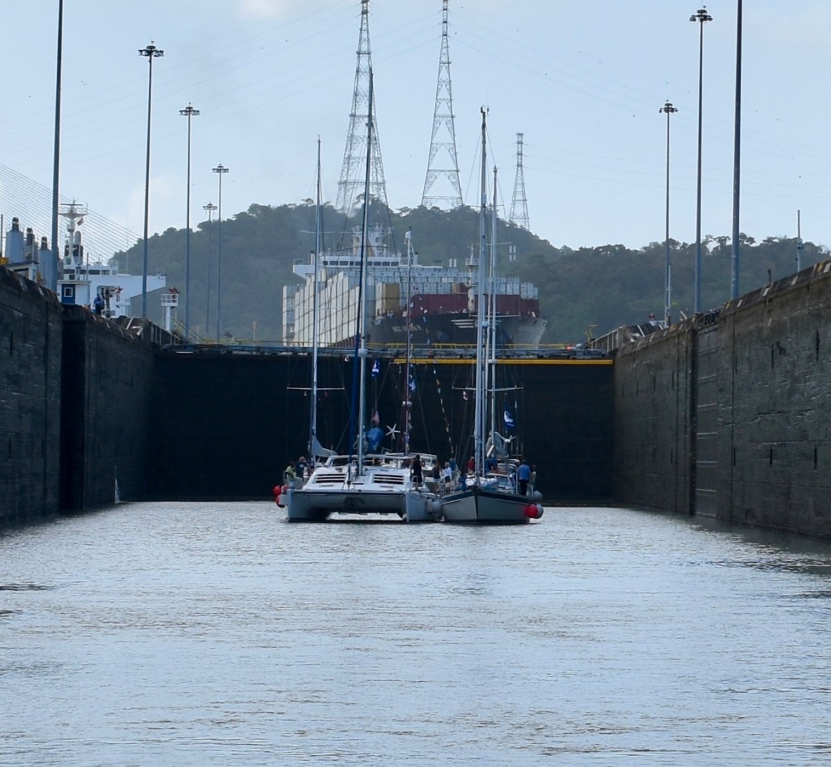 Here are a few pics from our Panama Canal crossing. We started late Sunday afternoon and went up through the Gatun Locks arriving in Gatun Lake after dark. We spent the night in the lake and motored across the lake Monday morning arriving at the Pedro Miguel and Miraflores Locks around 2 pm locking down to the Pacific. We are in Panama City for a few days before we leave for the Galapagos.