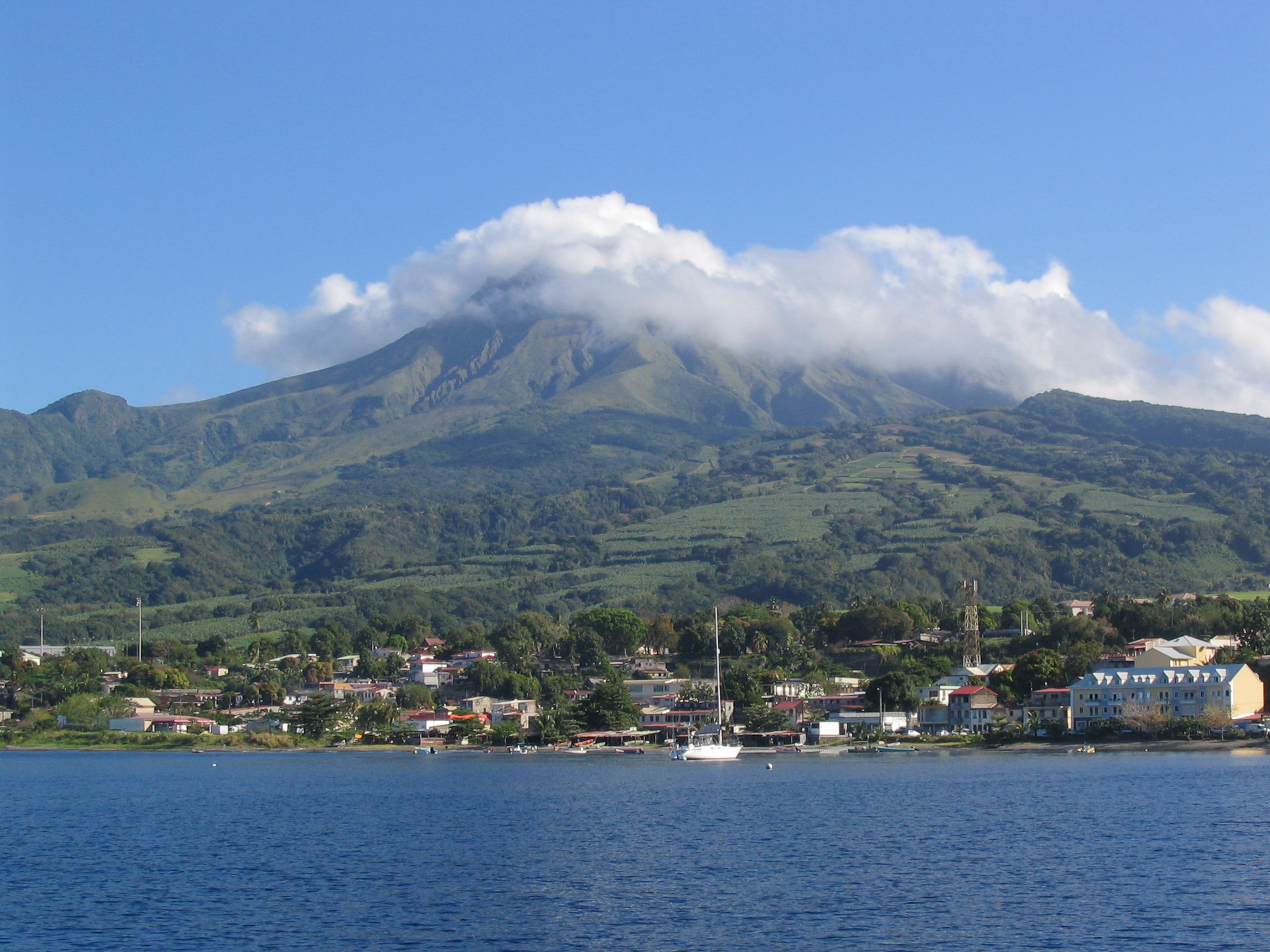 The morning after Austin left, we started our trek back to the north. We left Bequia at 5:00 a.m. and sailed up the west side of St. Vincent to Rodney Bay, St. Lucia, about 80 miles. A very long day. Rodney Bay Marina is where the ARC (Atlantic Rally for Cruisers) finishes each year so there are lots of European boats in the marina and in the area. After a couple of days in Rodney Bay working on the boat, we sailed up to St. Pierre on the French island of Martinique. St. Pierre is a small town with a long history at the base of Mt. Pele on the north end of the island. After anchoring off the town dock, we spent a couple of hours at the local museum. St. Pierre was established in the 1600’s and by the late 1800’s was known as the Paris of the Caribbean with over 30,000 residents. But, on May 8, 1902, Mt. Pele intervened. It erupted and destroyed the entire town, including most of the ships anchored in the harbor. The side of the volcano facing the town collapsed releasing a fireball of superheated gas that rolled down and burned the entire town killing all of the residents except one. The only survivor (a man named Cyparis) was locked up for murder in the solitary confinement cell in the basement of the local prison. Although he survived, he was burned badly. After recovering, he spent the next 20 years or so as a side show act in the Barnum and Bailey circus touring the U.S. Many of the ruins still remain in the town. We toured the local theater that was built in the late 1600’s. The town now has only about 6000 residents and Mt. Pele is considered dormant.