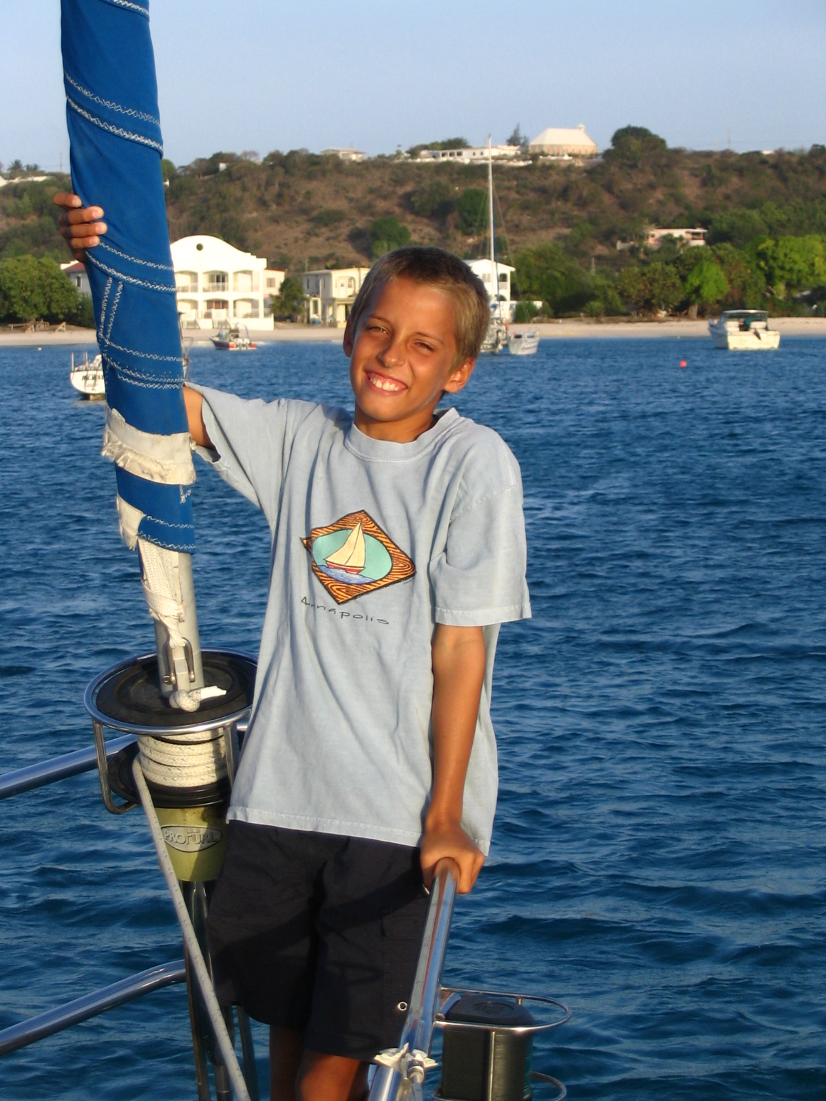 We sailed up from Dominica on a day when the trades were blowing vigorously. We had winds from the east at 20 to 30 knots and 8 to 10 foot seas. The boat loves those conditions and we were reaching along at around 9 knots. Because the easterly trades where blowing steadily, we elected to head to the island of Terre D’en Haut and anchor off the town of Bourg de Saintes which provided good protection from the east. It is very hard not to like the small towns on the French islands. Great restaurants and stores, beautiful beaches, and nice people. We spent 4 days in Bourg de Saintes hanging out on the beaches and eating in the bakeries and restaurants. Because of the current weakness of the dollar against the euro, the French islands can be a bit expensive. (Most of the other islands use either the dollar or a currency that has a fixed exchange rate against the dollar.) The next island north is another French island, Guadeloupe. We headed up the west side of Guadeloupe and stopped at Pigeon Island, a Cousteau Underwater Park. We snorkeled around the island and had great visibility in the water, in excess of 150 feet. We then headed up to Deshaies, the northern most harbor on the western side of Guadalupe and a good jumping off point for a long sail up to Antigua. The next day when we were departing for Antigua at about 6:00 a.m the windlass stopped working and we had to finish pulling up the anchor and rode by hand. The windlass is an electric device that is used to let down and pull up the anchor. Our anchor weighs 80 pounds and the chain attached to it weighs about 2 pounds per foot. We usually let out about 100 feet of rode when anchoring so having a working windlass is critical. Without a functioning windlass anchoring is difficult so we headed to Jolly Harbor, a marina on the west side of Antigua where there are several marine stores.