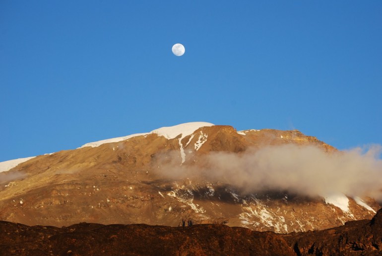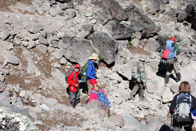 We are up early again to get ready for a long day. Starting at 13,600 feet, our plan is to hike up to the Lava Tower at 15,000 feet, try to arrive by 12:30 p.m. or so, eat lunch, and then hike down to the Baranco camp at 12,800 feet. It will make for along day, but the big changes in altitude are all part of our guides’ efforts to get our bodies to acclimatize to the higher altitude (“climb high, sleep low”). In the morning, Hal has a slight headache again which is not responding to Advil. We leave the Moir camp around 8:30 a.m. and hike steadily uphill until lunch, gaining about 1500 feet in altitude. For the first time, we start to see other climbers as the Lemosho trail (the one we are on) joins up with the Machame route near Lava Tower. By the time we reach Lava Tower at 15,000 feet, Hal has a nasty altitude headache, which makes it hard to eat lunch. The others eat lunch at Lava Tower and then we start down the trail to the Baranco camp, arriving there about 4:30 p.m., dropping about 2200 feet in altitude. Shortly after we arrive at the Baranco camp (12,800 feet), Hal’s headache is gone. Everyone else feels great and is not affected by the altitude. The Baranco camp is in a spectacular spot, right on the banks of a glacier mountain steam (our drinking water) and just below the western glaciers of the Kibo peak (6300 feet above us). Everyone is tired after another long day of hiking up about 1500 feet and then down 2200 feet. The weather again is clear and cold at night with a full moon and lots of stars. We are in the southern hemisphere now so we see some constellations that are new to us.